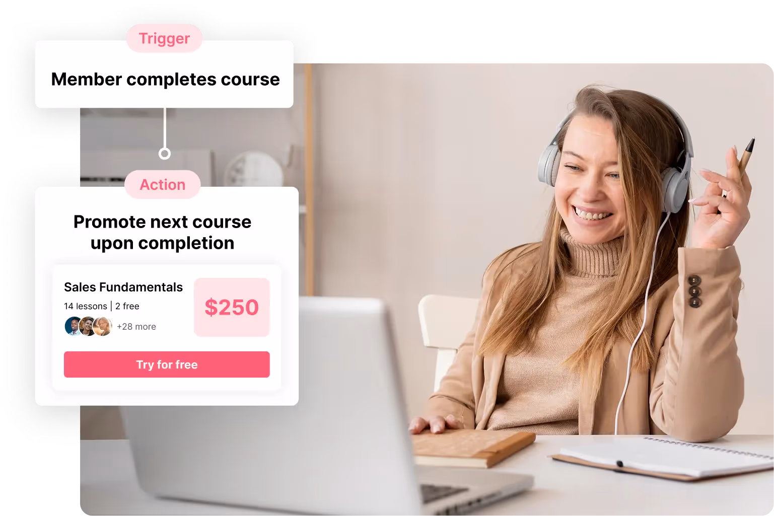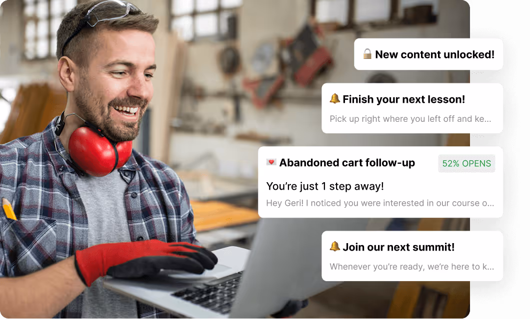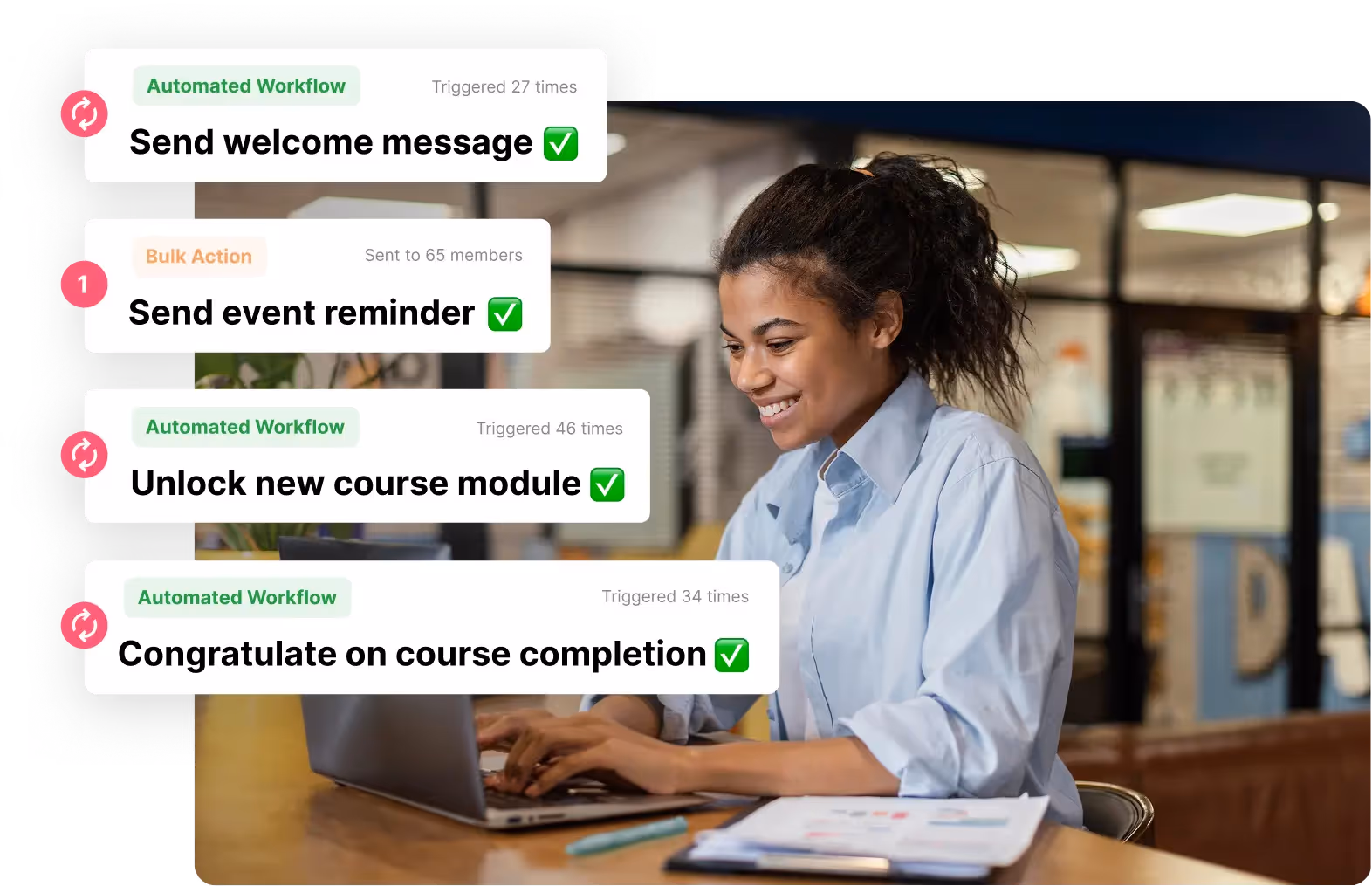 Send messages, unlock access, or trigger reminders as members join, attend events, finish courses, upgrade, and more.